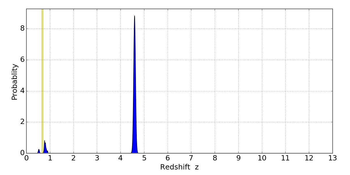 In P(z) plots: Yellow lines mark the cluster redshift z = 0.677,