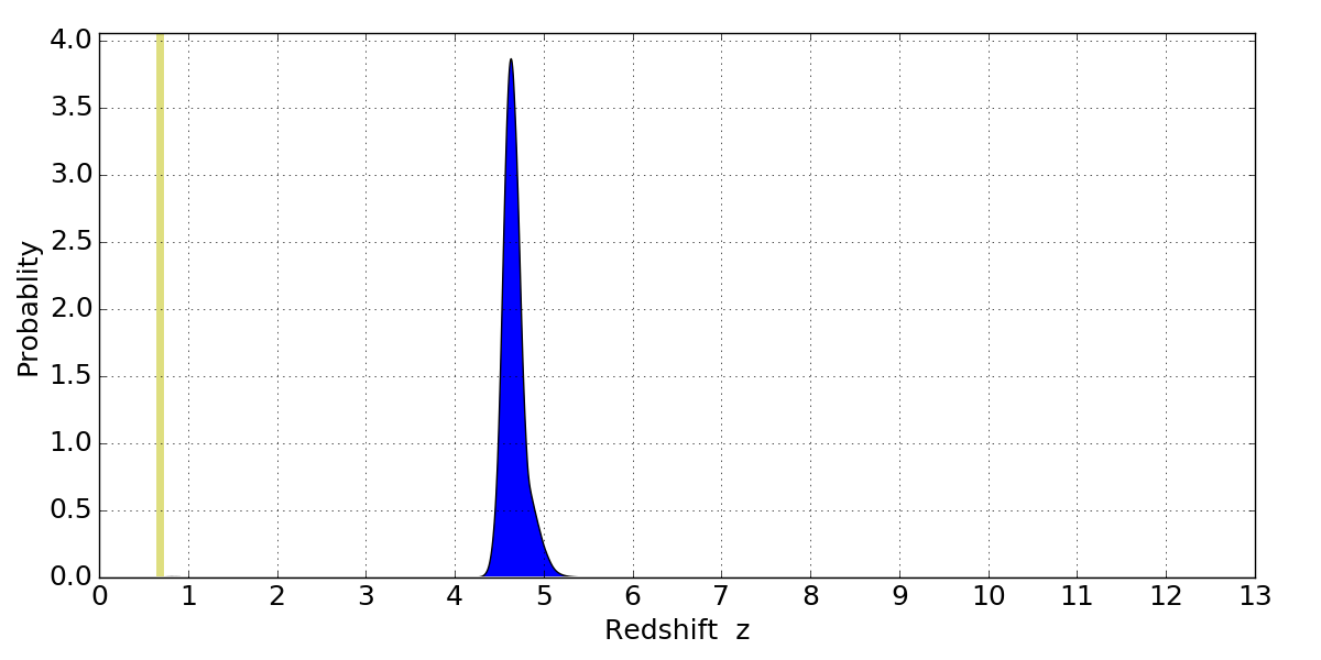 In P(z) plots: Yellow lines mark the cluster redshift z = 0.677,