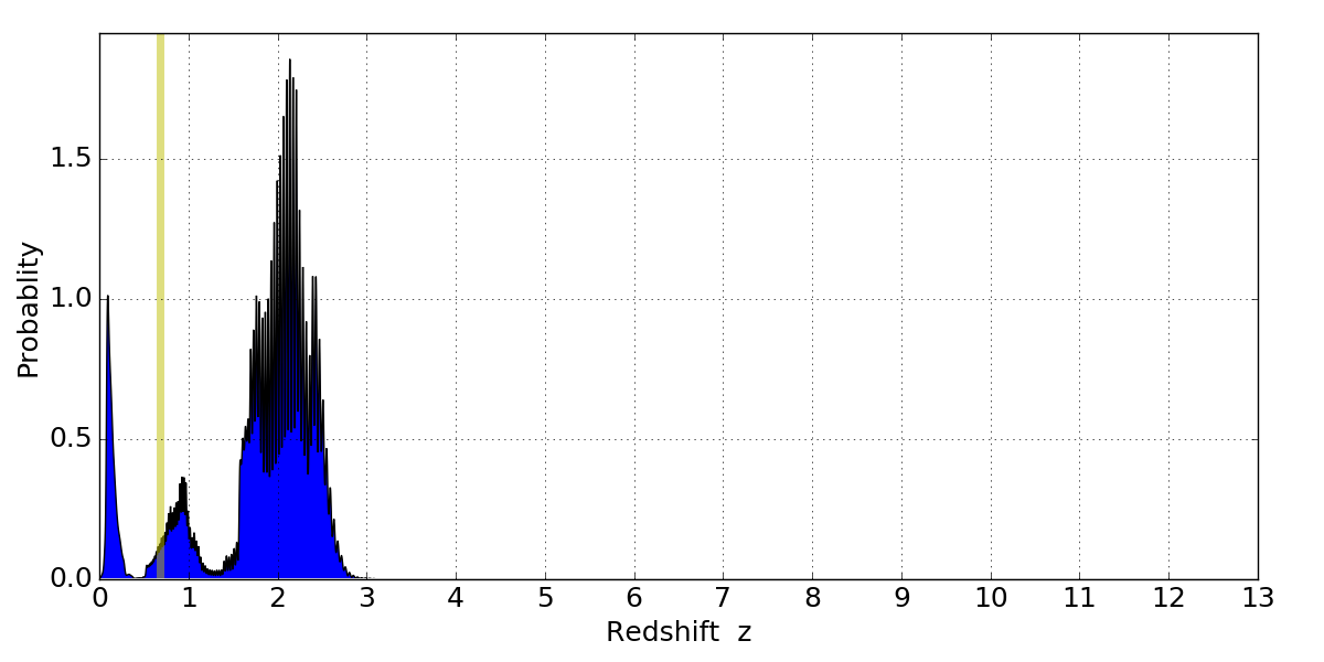 In P(z) plots: Yellow lines mark the cluster redshift z = 0.677,