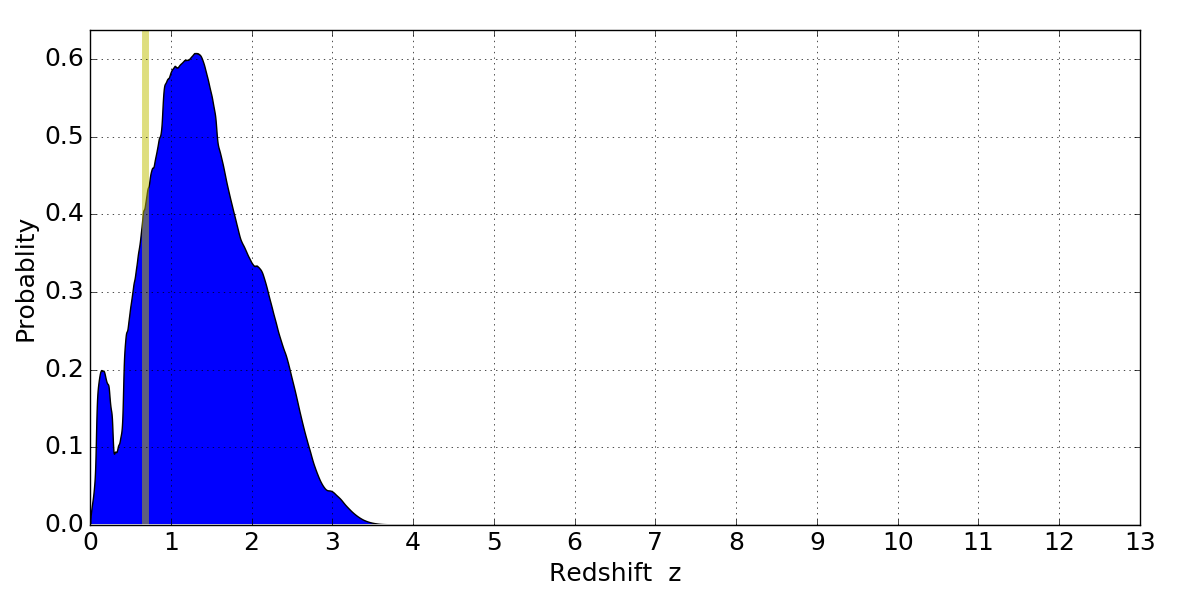 In P(z) plots: Yellow lines mark the cluster redshift z = 0.677,