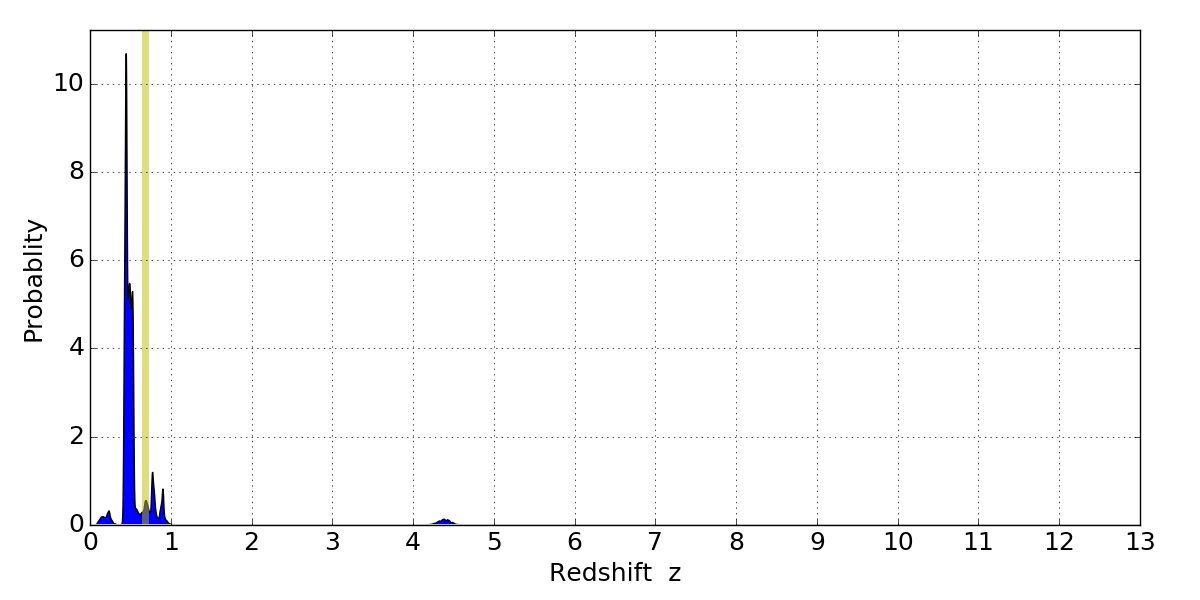 In P(z) plots: Yellow lines mark the cluster redshift z = 0.677,