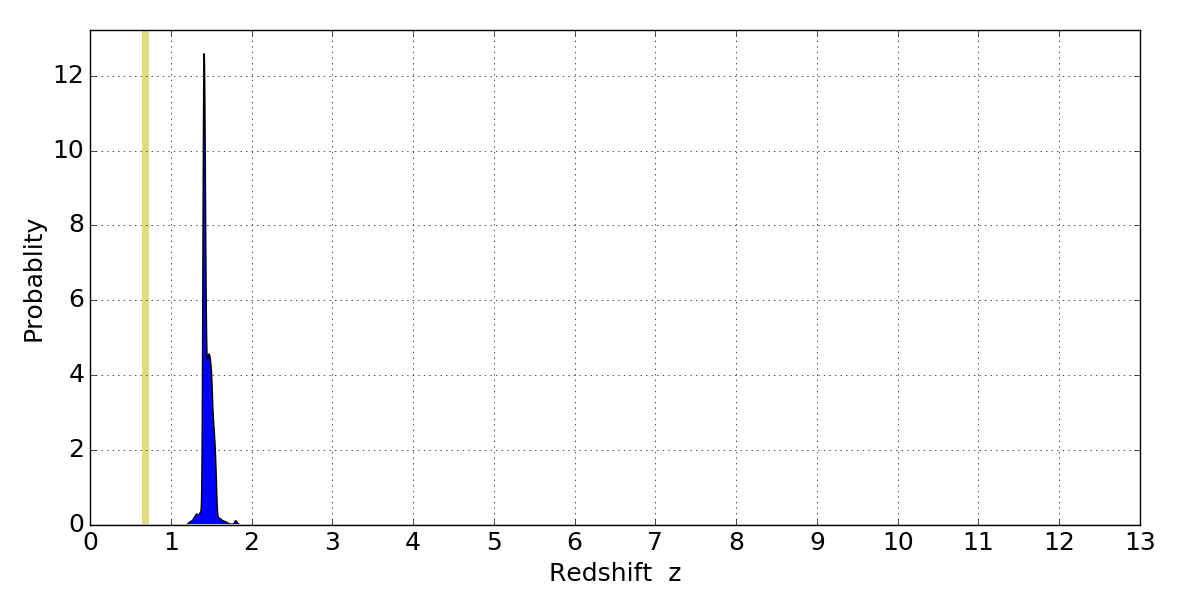 In P(z) plots: Yellow lines mark the cluster redshift z = 0.677,