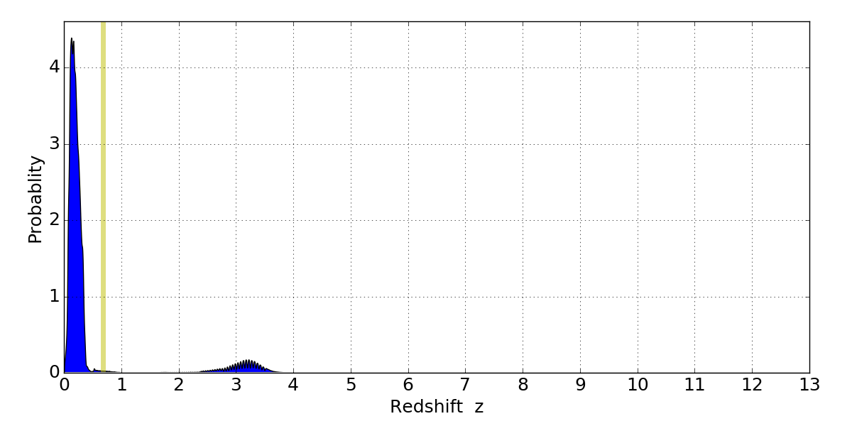 In P(z) plots: Yellow lines mark the cluster redshift z = 0.677,