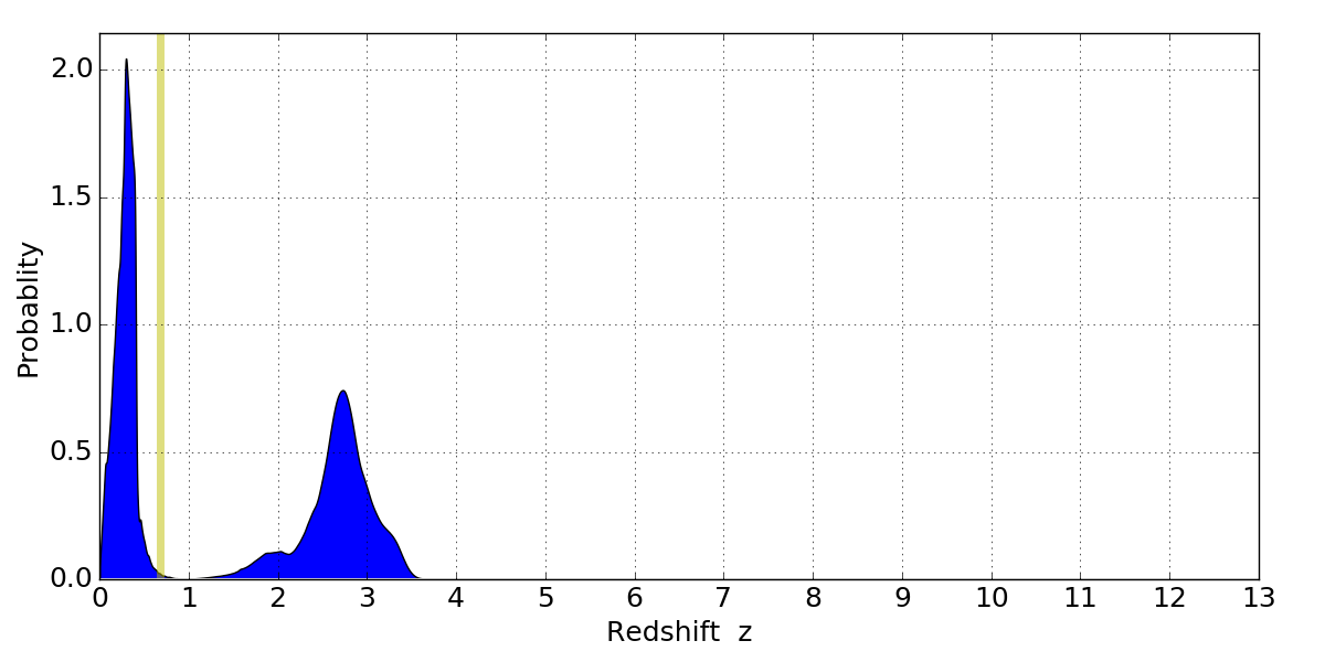 In P(z) plots: Yellow lines mark the cluster redshift z = 0.677,