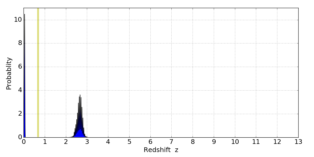 In P(z) plots: Yellow lines mark the cluster redshift z = 0.677,