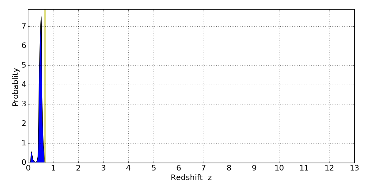 In P(z) plots: Yellow lines mark the cluster redshift z = 0.677,