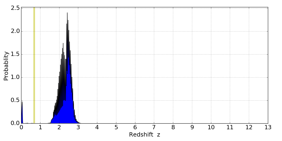 In P(z) plots: Yellow lines mark the cluster redshift z = 0.677,
