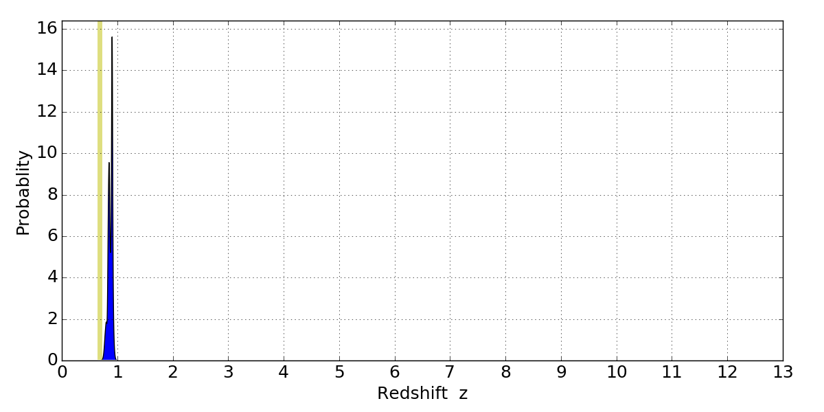 In P(z) plots: Yellow lines mark the cluster redshift z = 0.677,