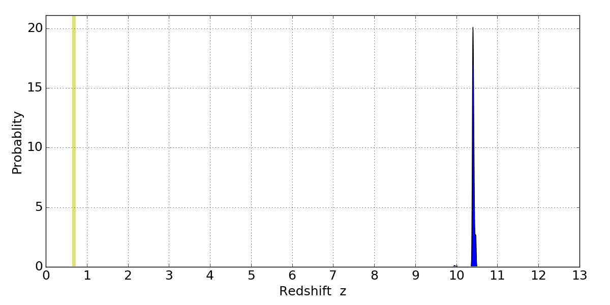 In P(z) plots: Yellow lines mark the cluster redshift z = 0.677,