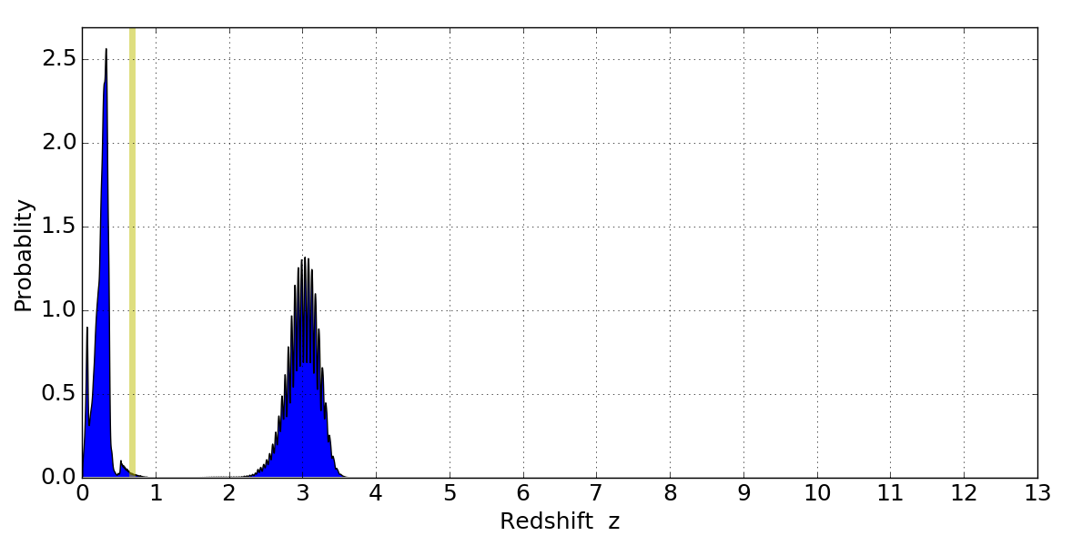 In P(z) plots: Yellow lines mark the cluster redshift z = 0.677,