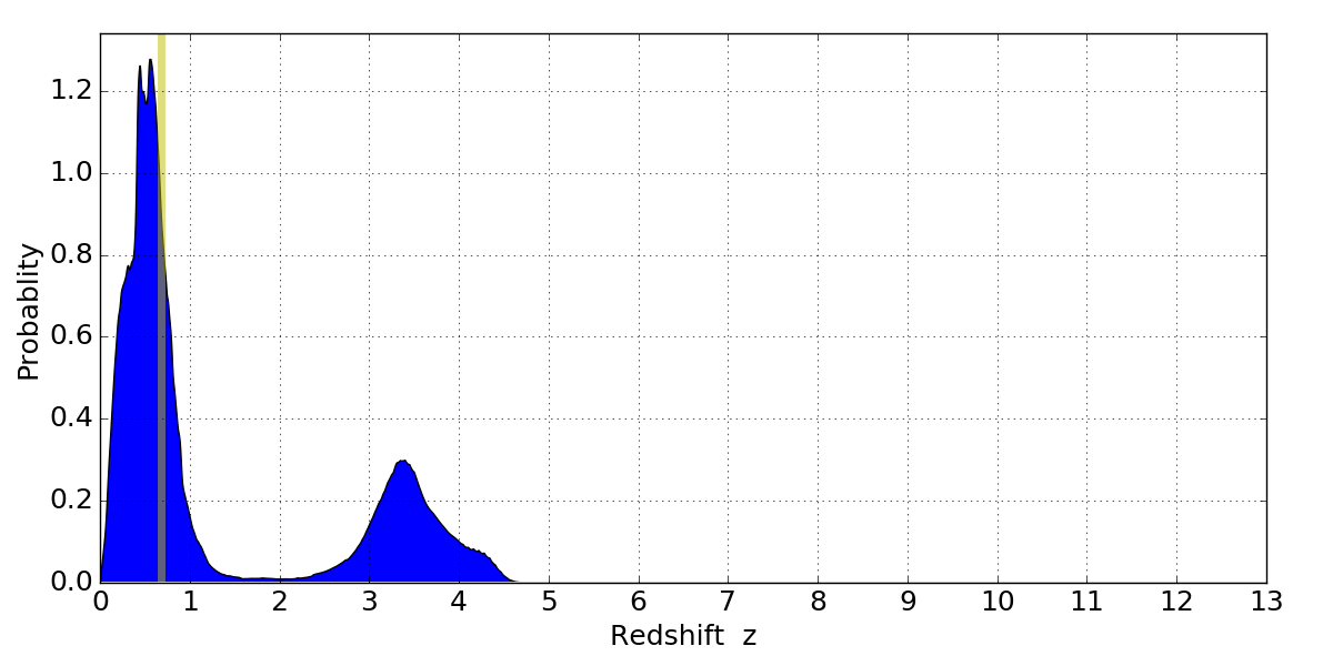 In P(z) plots: Yellow lines mark the cluster redshift z = 0.677,
