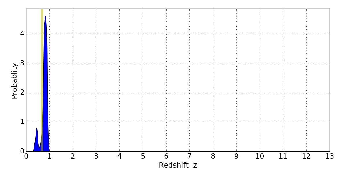 In P(z) plots: Yellow lines mark the cluster redshift z = 0.677,