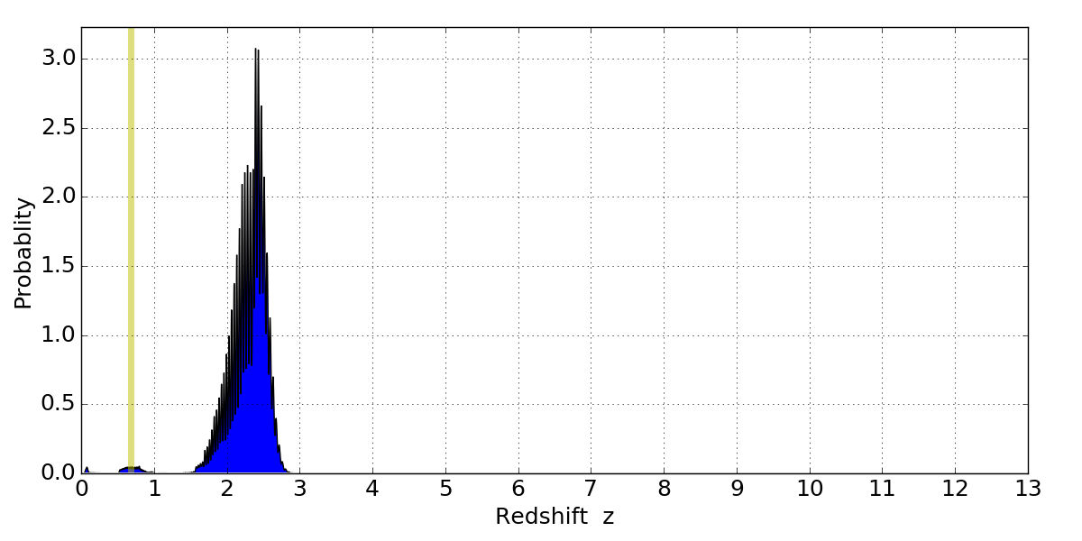 In P(z) plots: Yellow lines mark the cluster redshift z = 0.677,
