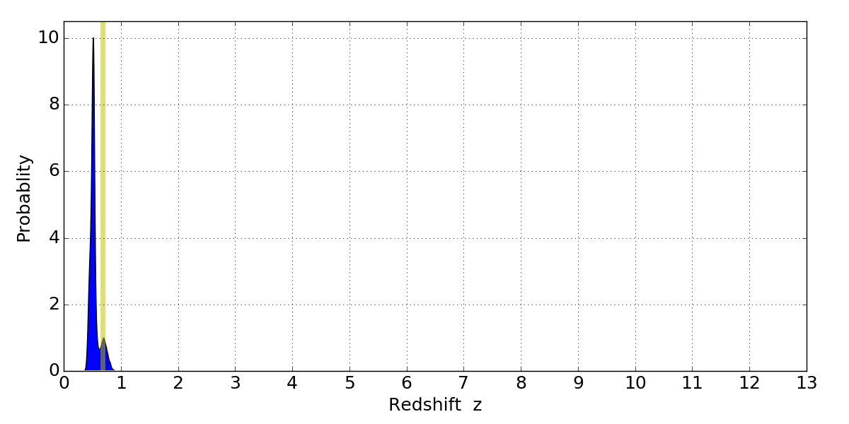 In P(z) plots: Yellow lines mark the cluster redshift z = 0.677,