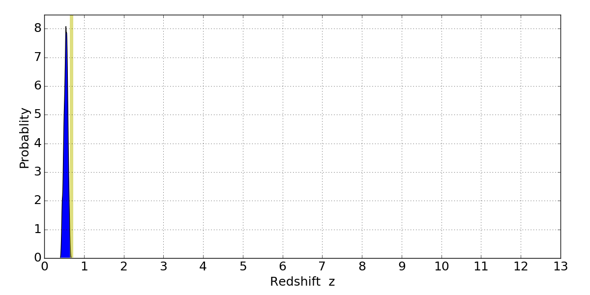In P(z) plots: Yellow lines mark the cluster redshift z = 0.677,