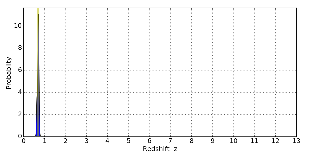In P(z) plots: Yellow lines mark the cluster redshift z = 0.677,