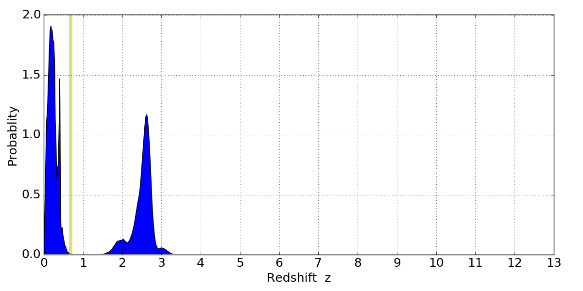 In P(z) plots: Yellow lines mark the cluster redshift z = 0.677,