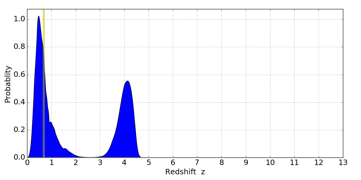 In P(z) plots: Yellow lines mark the cluster redshift z = 0.677,