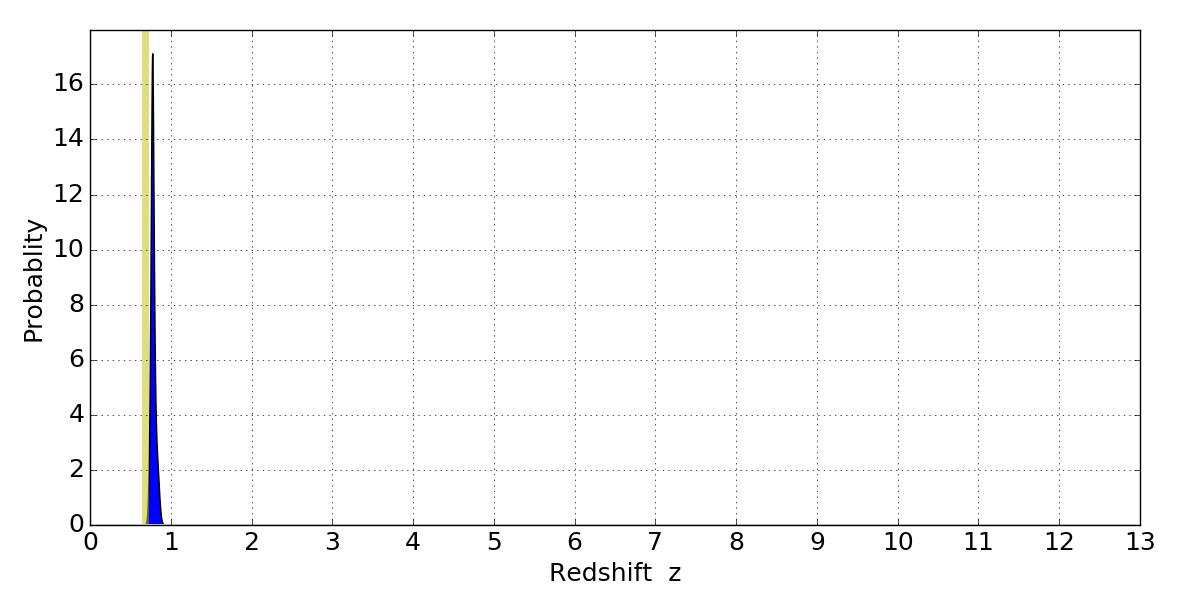 In P(z) plots: Yellow lines mark the cluster redshift z = 0.677,