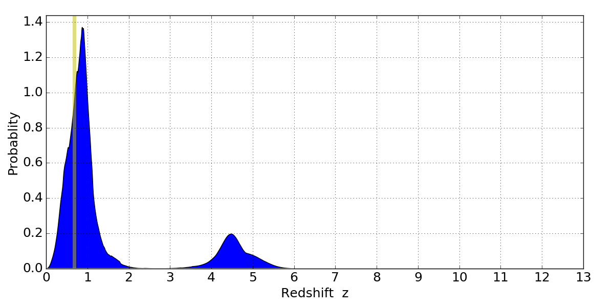 In P(z) plots: Yellow lines mark the cluster redshift z = 0.677,