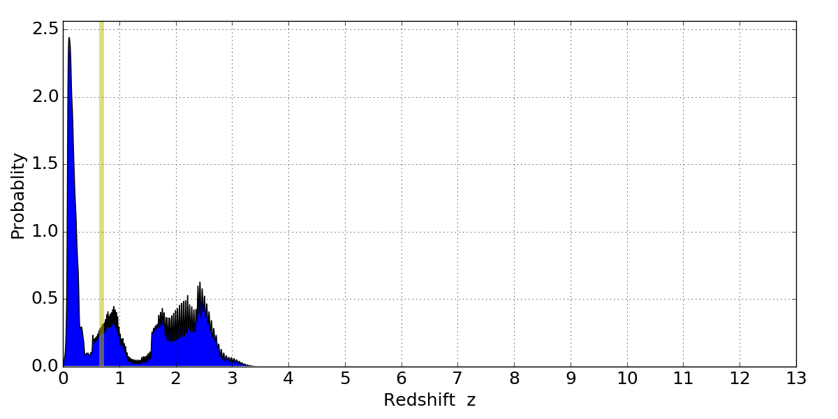 In P(z) plots: Yellow lines mark the cluster redshift z = 0.677,