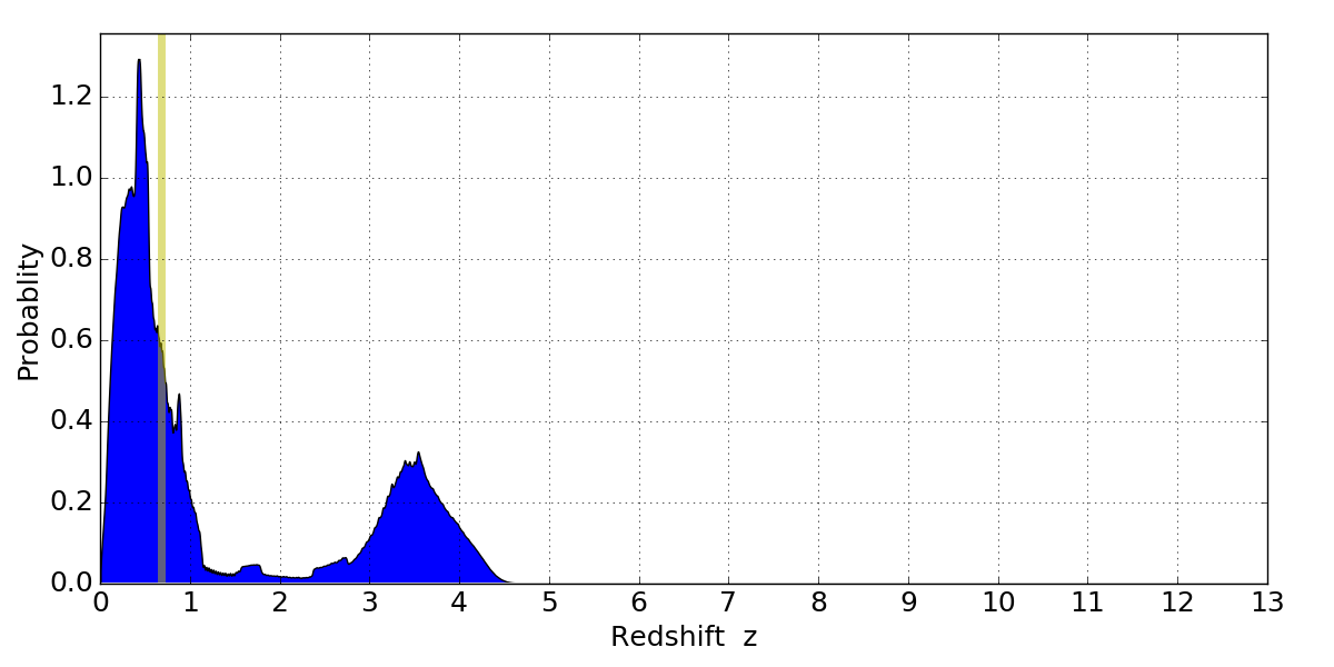 In P(z) plots: Yellow lines mark the cluster redshift z = 0.677,