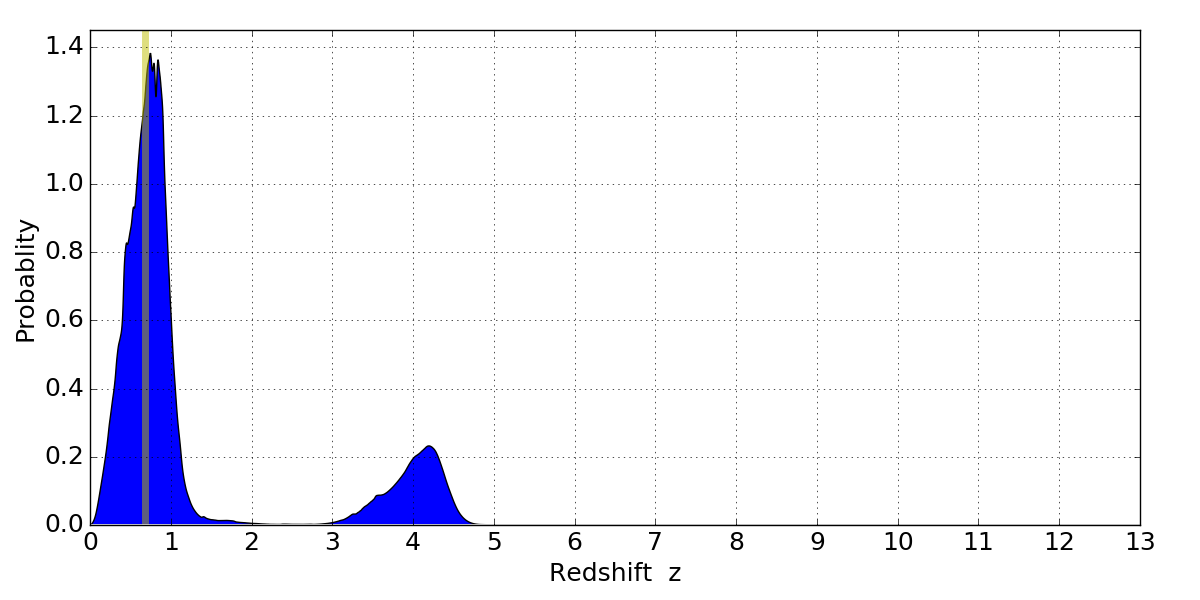 In P(z) plots: Yellow lines mark the cluster redshift z = 0.677,