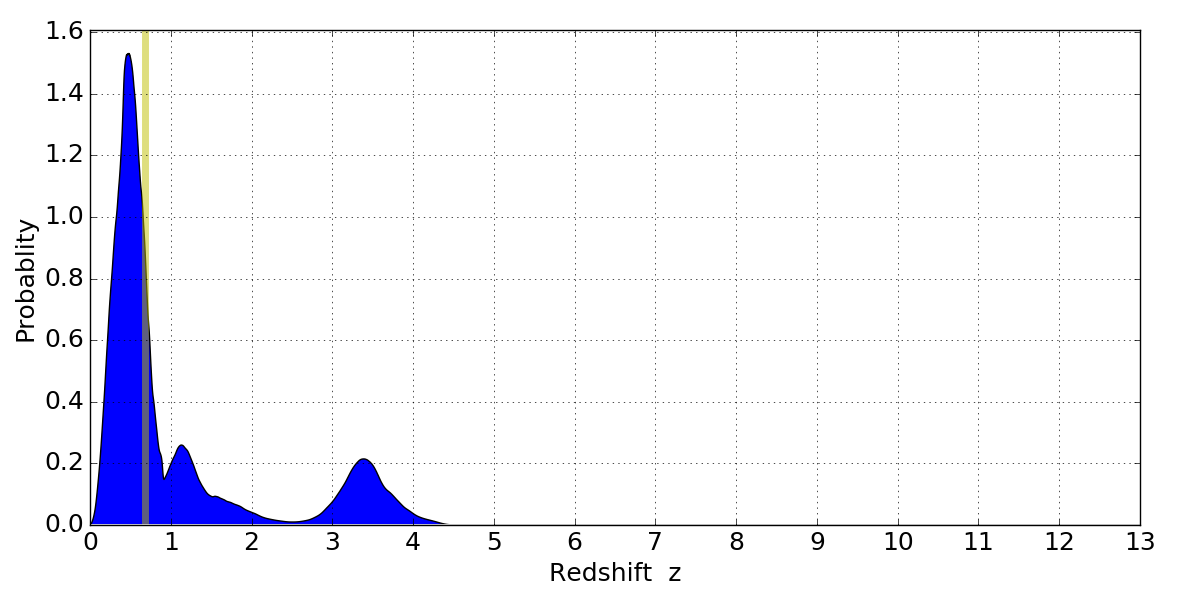 In P(z) plots: Yellow lines mark the cluster redshift z = 0.677,