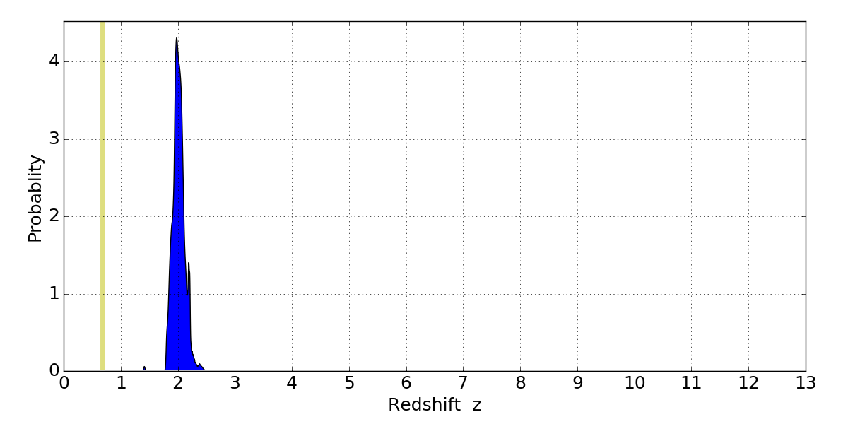 In P(z) plots: Yellow lines mark the cluster redshift z = 0.677,