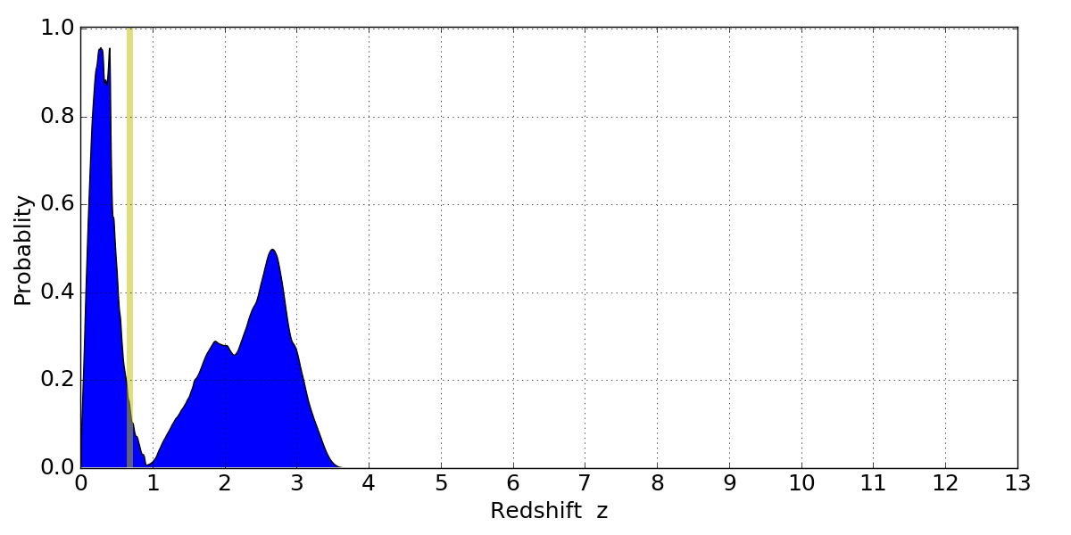 In P(z) plots: Yellow lines mark the cluster redshift z = 0.677,