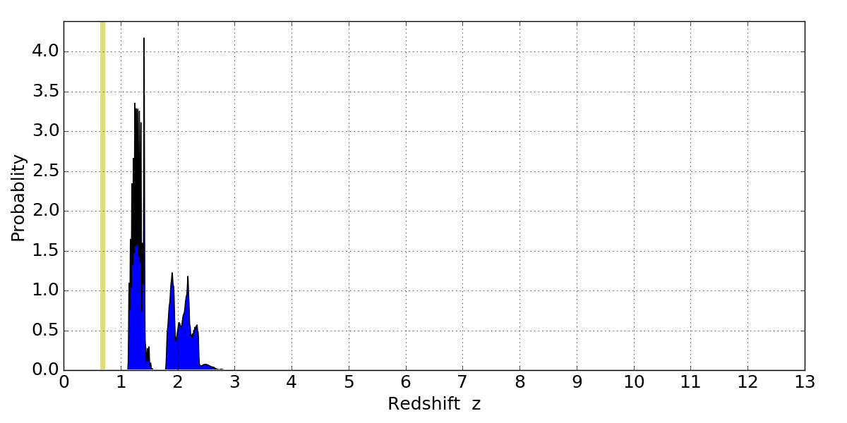 In P(z) plots: Yellow lines mark the cluster redshift z = 0.677,