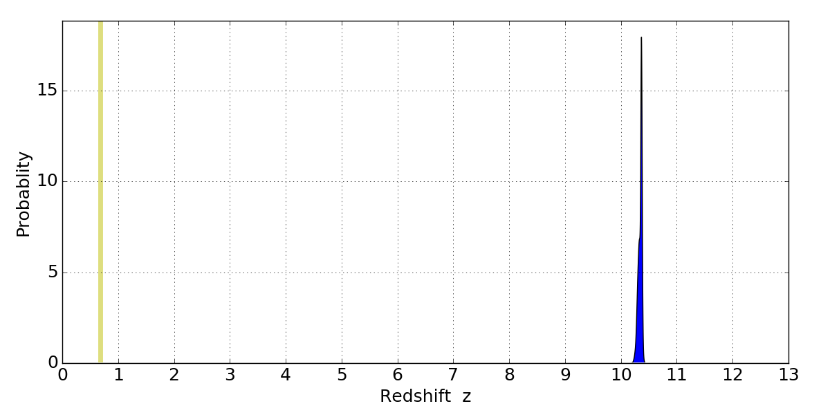In P(z) plots: Yellow lines mark the cluster redshift z = 0.677,
