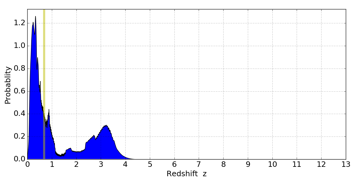 In P(z) plots: Yellow lines mark the cluster redshift z = 0.677,
