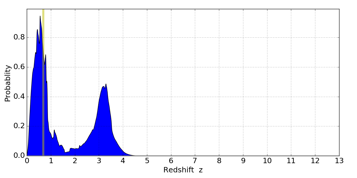 In P(z) plots: Yellow lines mark the cluster redshift z = 0.677,