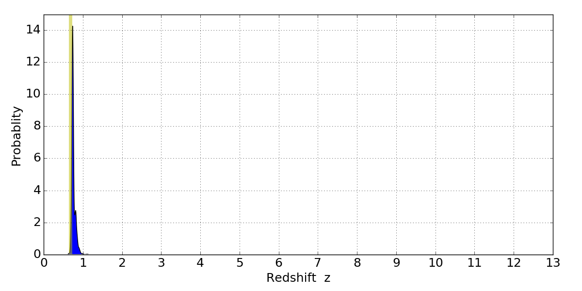 In P(z) plots: Yellow lines mark the cluster redshift z = 0.677,