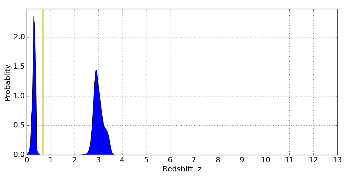 In P(z) plots: Yellow lines mark the cluster redshift z = 0.677,