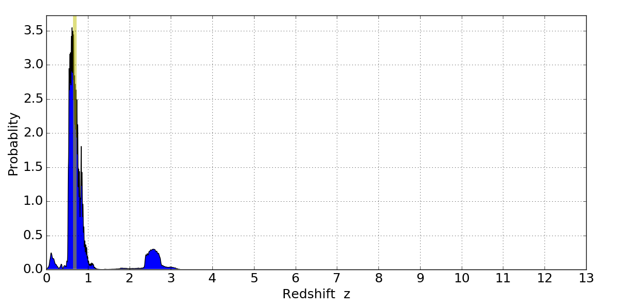 In P(z) plots: Yellow lines mark the cluster redshift z = 0.677,