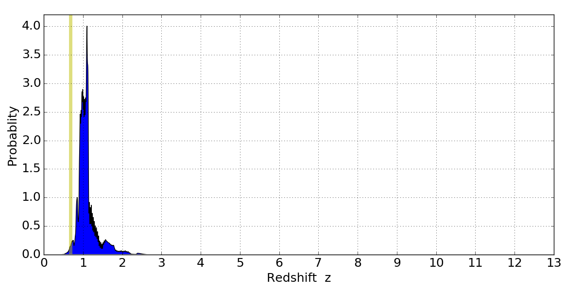 In P(z) plots: Yellow lines mark the cluster redshift z = 0.677,