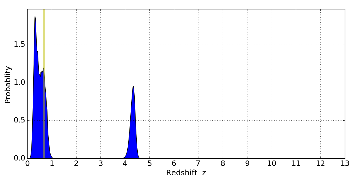 In P(z) plots: Yellow lines mark the cluster redshift z = 0.677,
