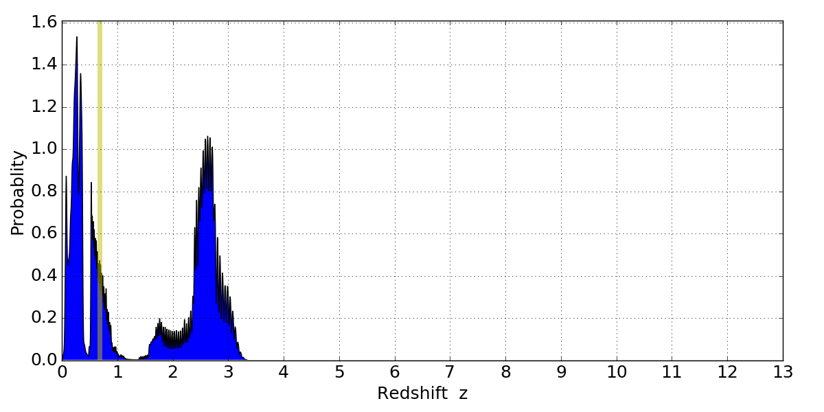 In P(z) plots: Yellow lines mark the cluster redshift z = 0.677,