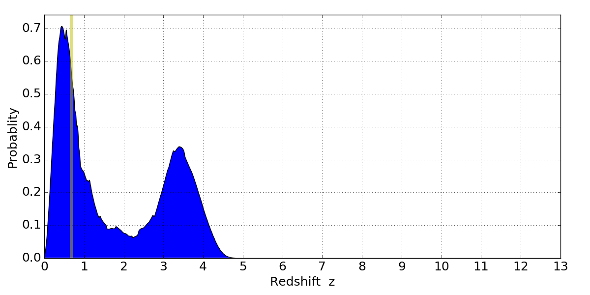 In P(z) plots: Yellow lines mark the cluster redshift z = 0.677,