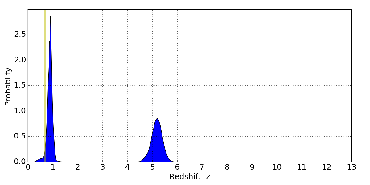 In P(z) plots: Yellow lines mark the cluster redshift z = 0.677,