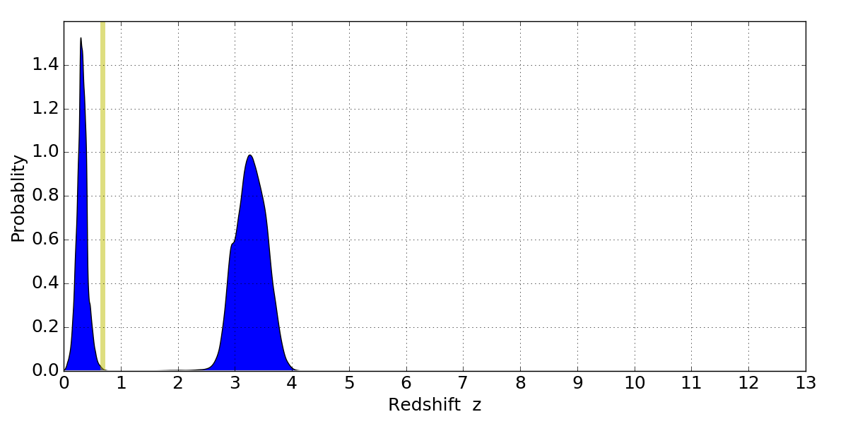 In P(z) plots: Yellow lines mark the cluster redshift z = 0.677,