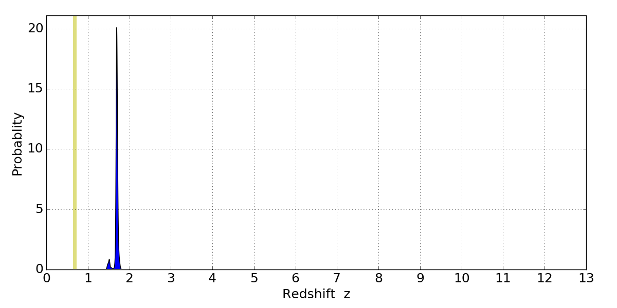 In P(z) plots: Yellow lines mark the cluster redshift z = 0.677,