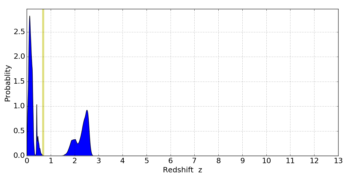 In P(z) plots: Yellow lines mark the cluster redshift z = 0.677,