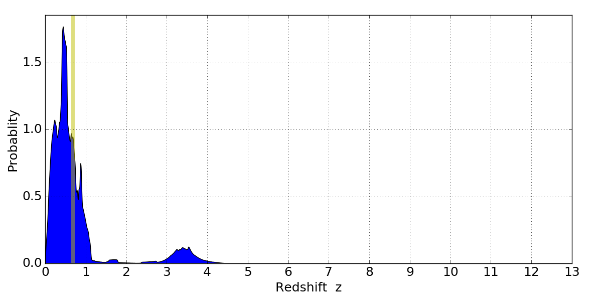 In P(z) plots: Yellow lines mark the cluster redshift z = 0.677,