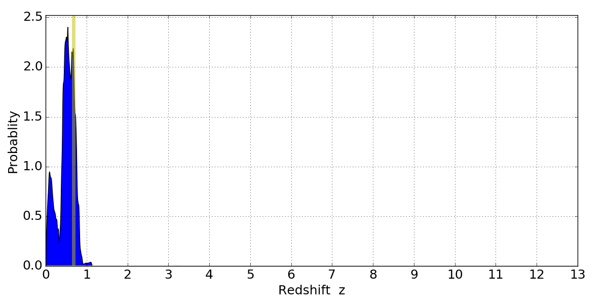In P(z) plots: Yellow lines mark the cluster redshift z = 0.677,
