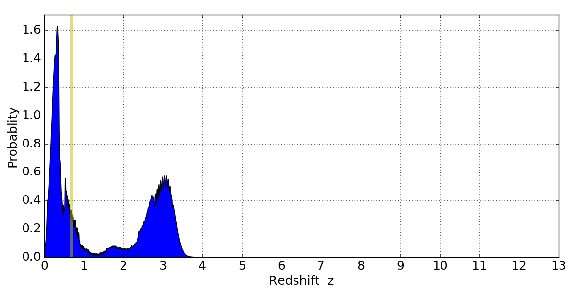 In P(z) plots: Yellow lines mark the cluster redshift z = 0.677,