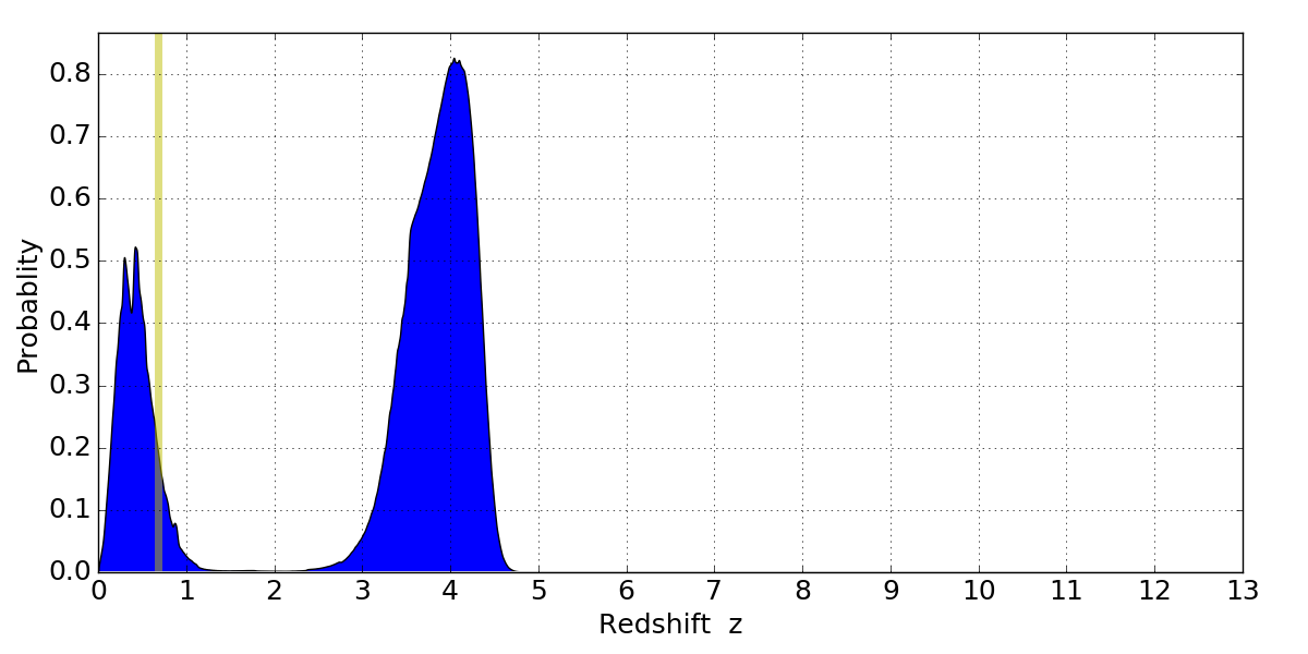 In P(z) plots: Yellow lines mark the cluster redshift z = 0.677,