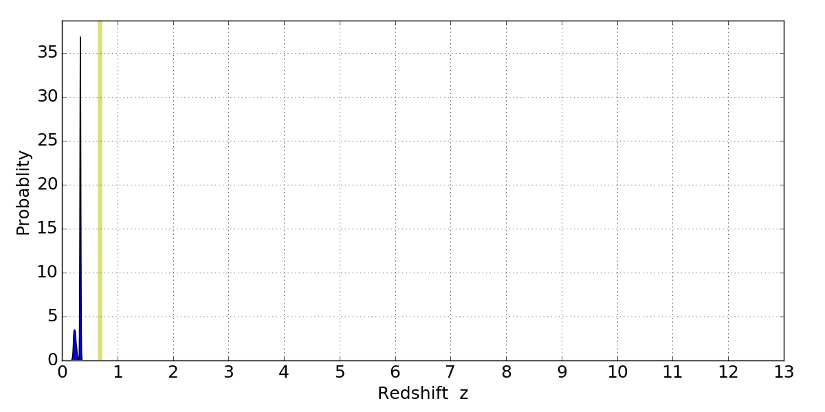 In P(z) plots: Yellow lines mark the cluster redshift z = 0.677,